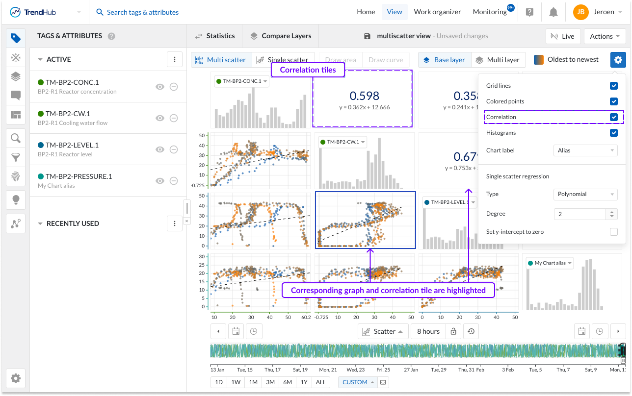 Tag selection - All visualized tags will be shown in the multi scatter plot. To change the order of the charts, you can change the order in the tag list, or use the labels of visualized tags or attributes on the chart itself. A dropdown will appear, containing all visualized tags.